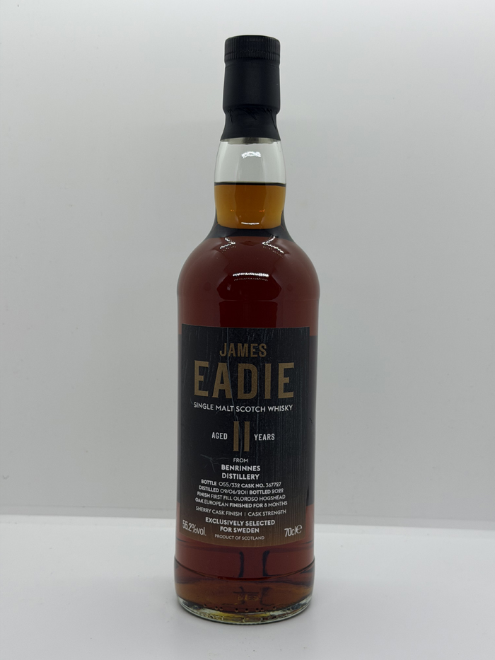Jag kom i kontakt med James Eadie via ett antal riktigt mörka flaskor de hade släppt. Jag ordnade en onlineprovning med dessa flaskor och satte James Eadie i kontakt med Selected Malts. Det resulterade så småningom i en buteljering för Slainte. Jag ville givetvis ha nånting med mycket färg och sherryinfluenser. Valet föll på denna 11-åriga Benrinnes som fått 8 månader på ett first fill European oak Oloroso hogshead. Vår logotype frinns på baksidesetiketten.